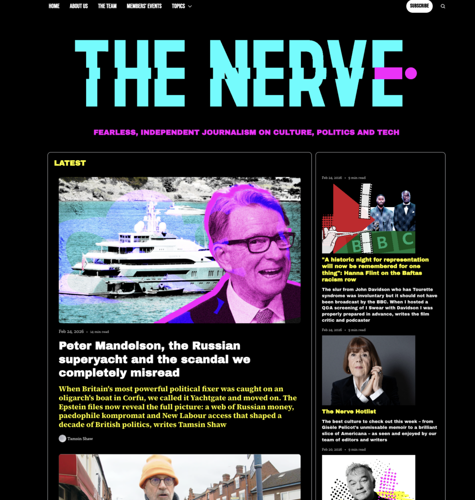 The Nerve, launched by former journalists from The Observer, is a compelling example. The model is built around a newsletter, a distinctive editorial voice and a direct relationship with a community of readers. The ambition is not mass reach, but a loyal, engaged readership willing to financially support the project.