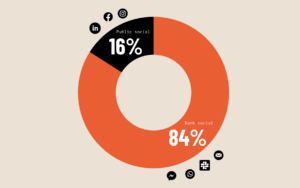 Plusieurs études ont tenté de quantifier l’ampleur du phénomène. Digimind propose une lecture de la répartition des sources de trafic qui met en évidence un déséquilibre structurel. Selon cette visualisation, près de 84 % de la circulation des contenus relèverait du dark social, regroupé sous les catégories « direct » ou « autres », tandis que les canaux visibles — réseaux sociaux publics, search, referral ou dispositifs payants — n’en représenteraient qu’une part limitée. Une répartition indicative, qui souligne surtout combien l’essentiel des échanges se joue aujourd’hui hors radar.