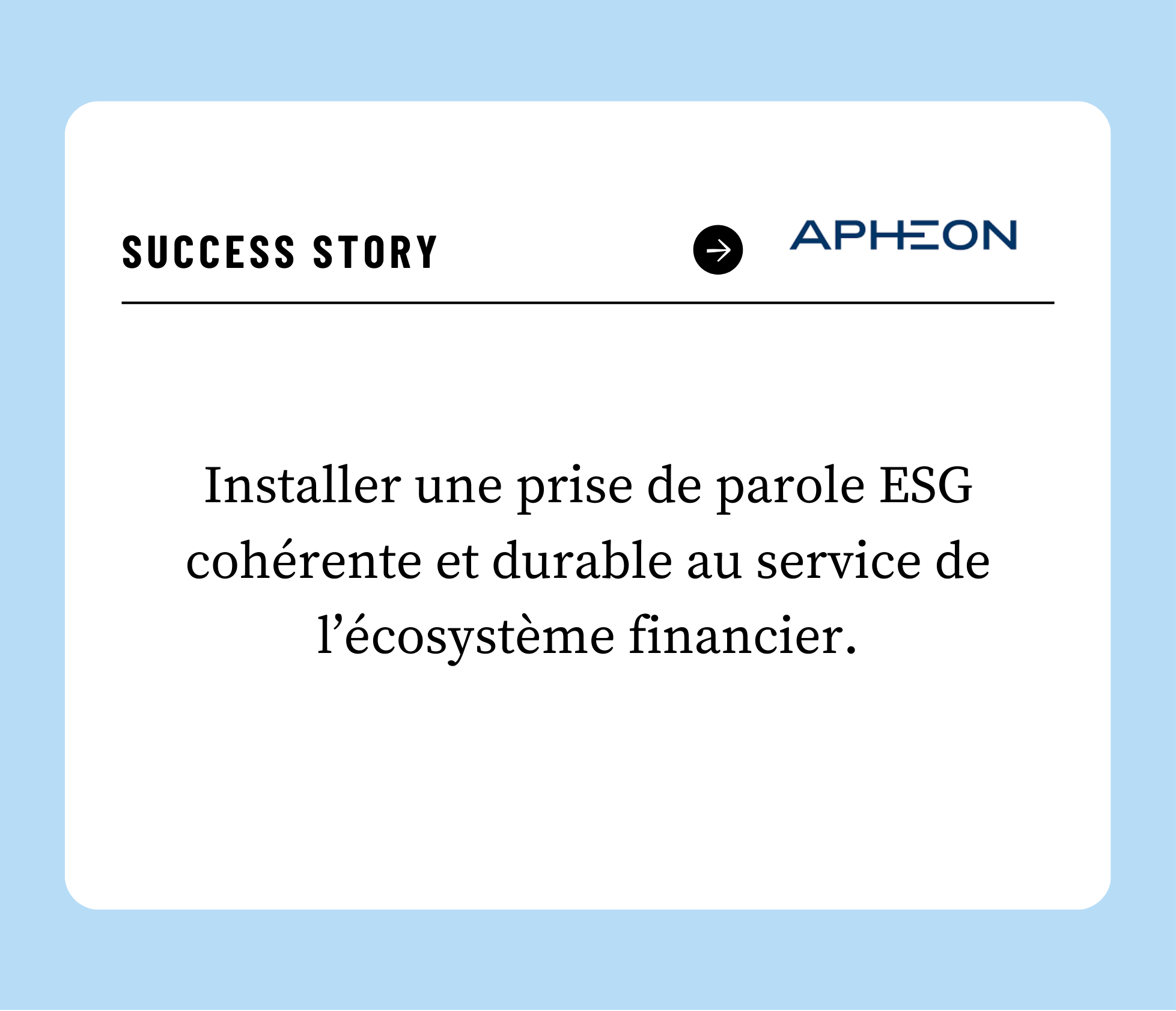 Depuis 2021, The Editorialist accompagne Apheon dans cette structuration, en intervenant sur la conception des rapports ESG et l’organisation de plusieurs dispositifs de diffusion multicanal, incluant contenus éditoriaux, graphiques et audiovisuels, afin d’assurer la cohérence et la continuité des prises de parole ESG du fonds.