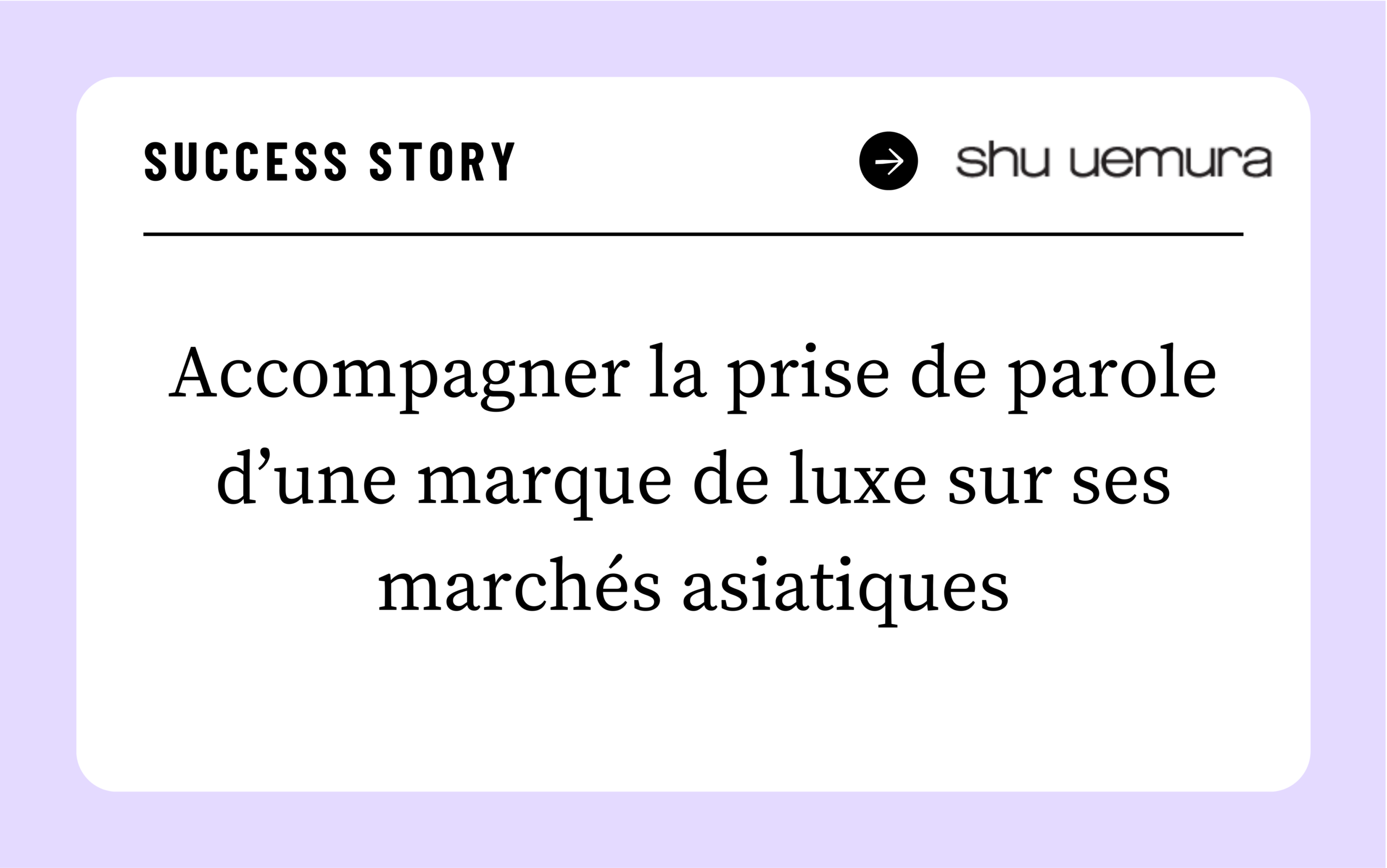 Marque japonaise de référence dans l’univers de la beauté, Shu Uemura développe des gammes de maquillage et de skincare reconnues pour leur exigence créative et leur ancrage culturel. Fortement implantée en Asie, la marque lance régulièrement des produits, dont certains sous forme d’éditions spéciales, nécessitant une prise de parole précise, codifiée et alignée avec les attentes des marchés locaux.